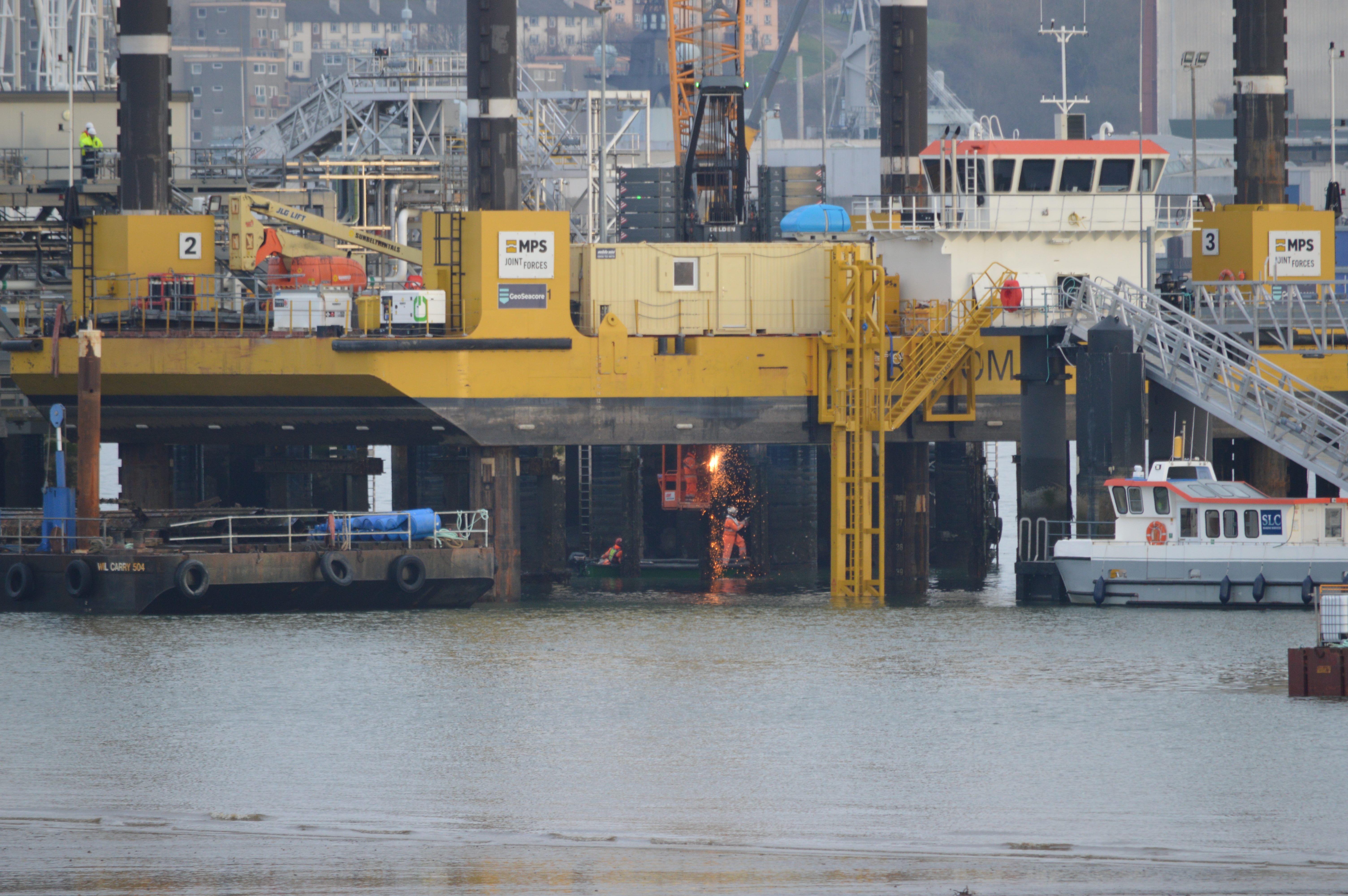 This image shows two workers cutting steel underneath the old jetty. On the left of the photo is the barge, WIL CARRY 504, also called Sgt Pepper, used to remove the parts of the old jetty. On the right of the photo is the small grey and white ferry used to transport the workers to and from various parts of the site.