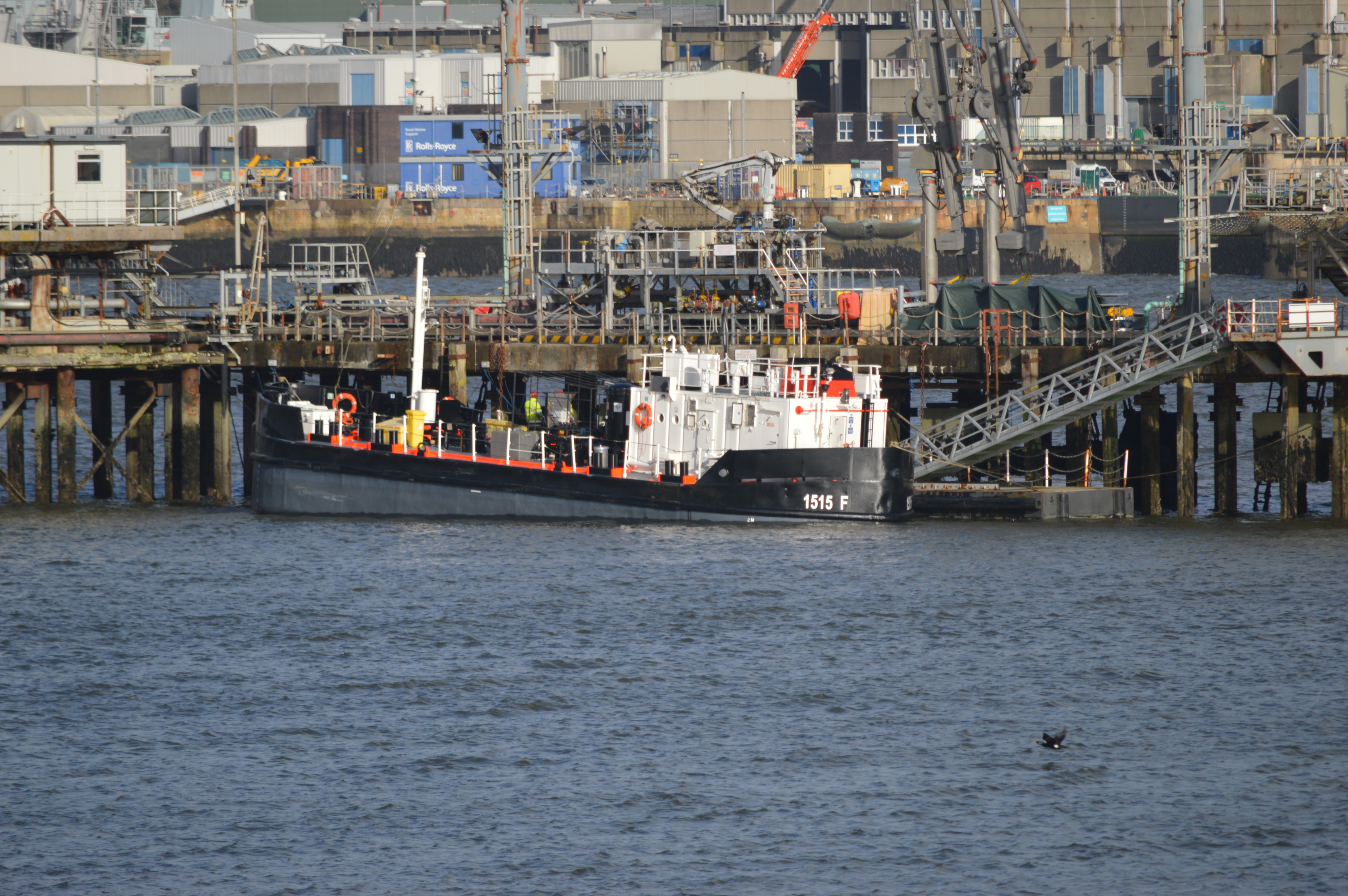 Above, we see a similar rare event, this time showing HMS Scott being refuelled from Yonderberry jetty on 20 Feb 2015. The lighter, 1503F - shown here - is also present.