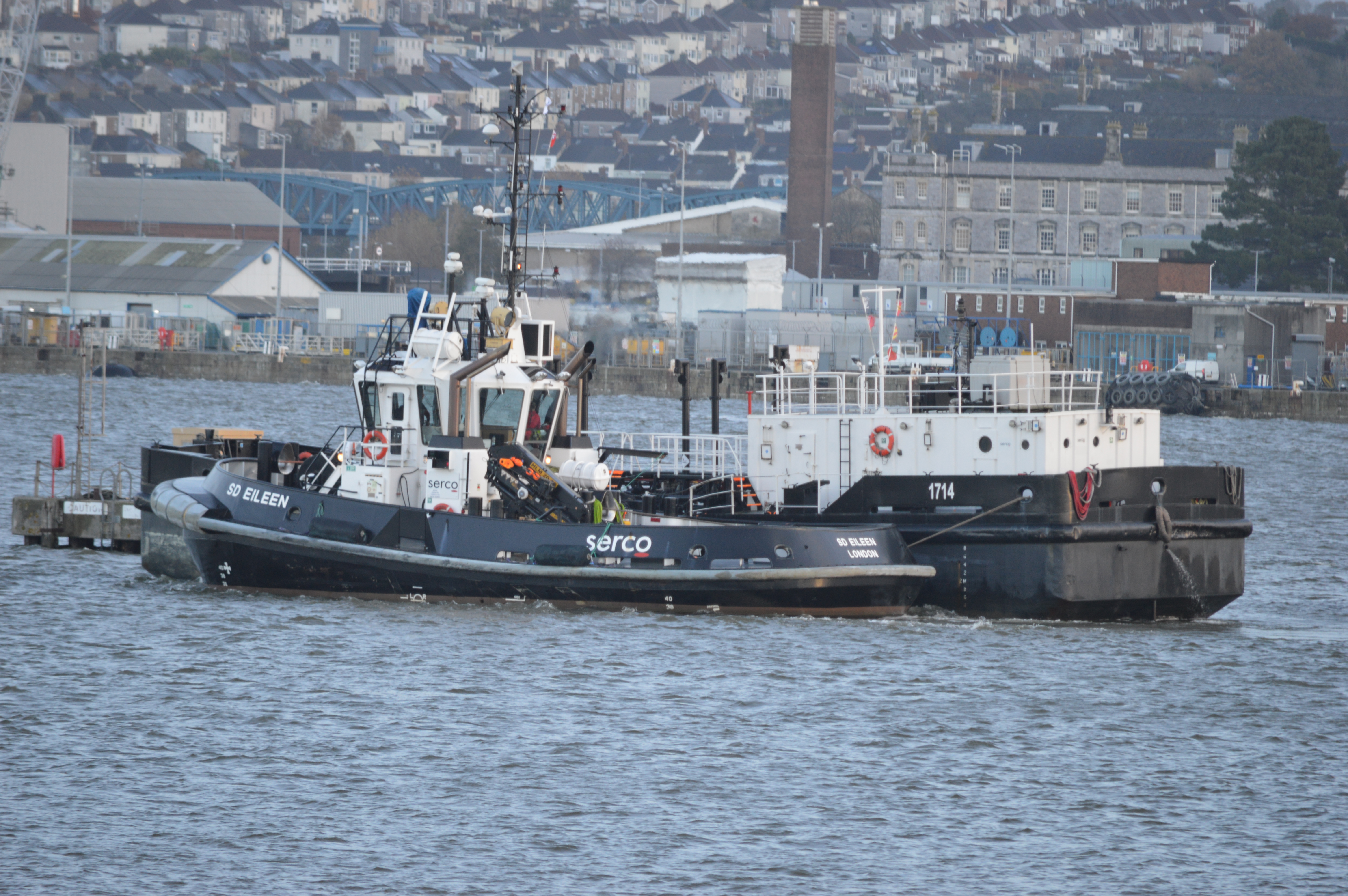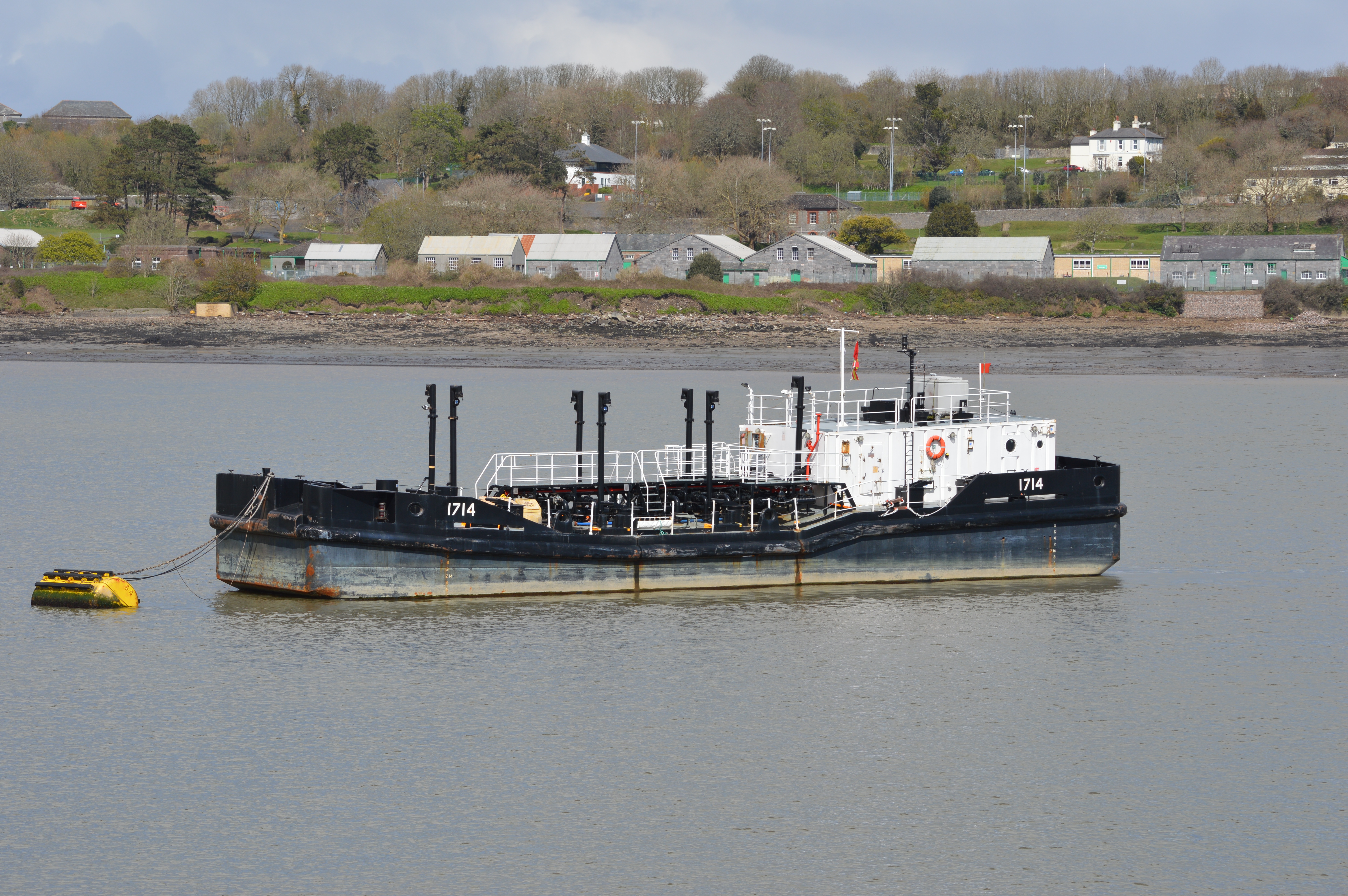 Lighter 1714 is another of the vessels used to draw fuel from Yonderberry jetty and deliver it to ships alongside in HMNB Devonport. These lighters are moved by tugs, once of the Port Auxiliary Service (PAS) and now belonging to the contractor Serco Denholm (SD).