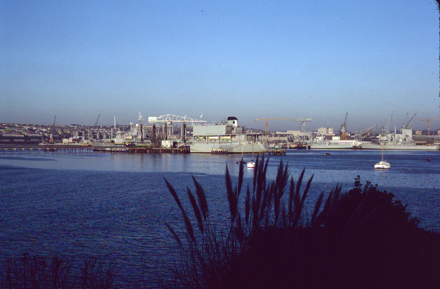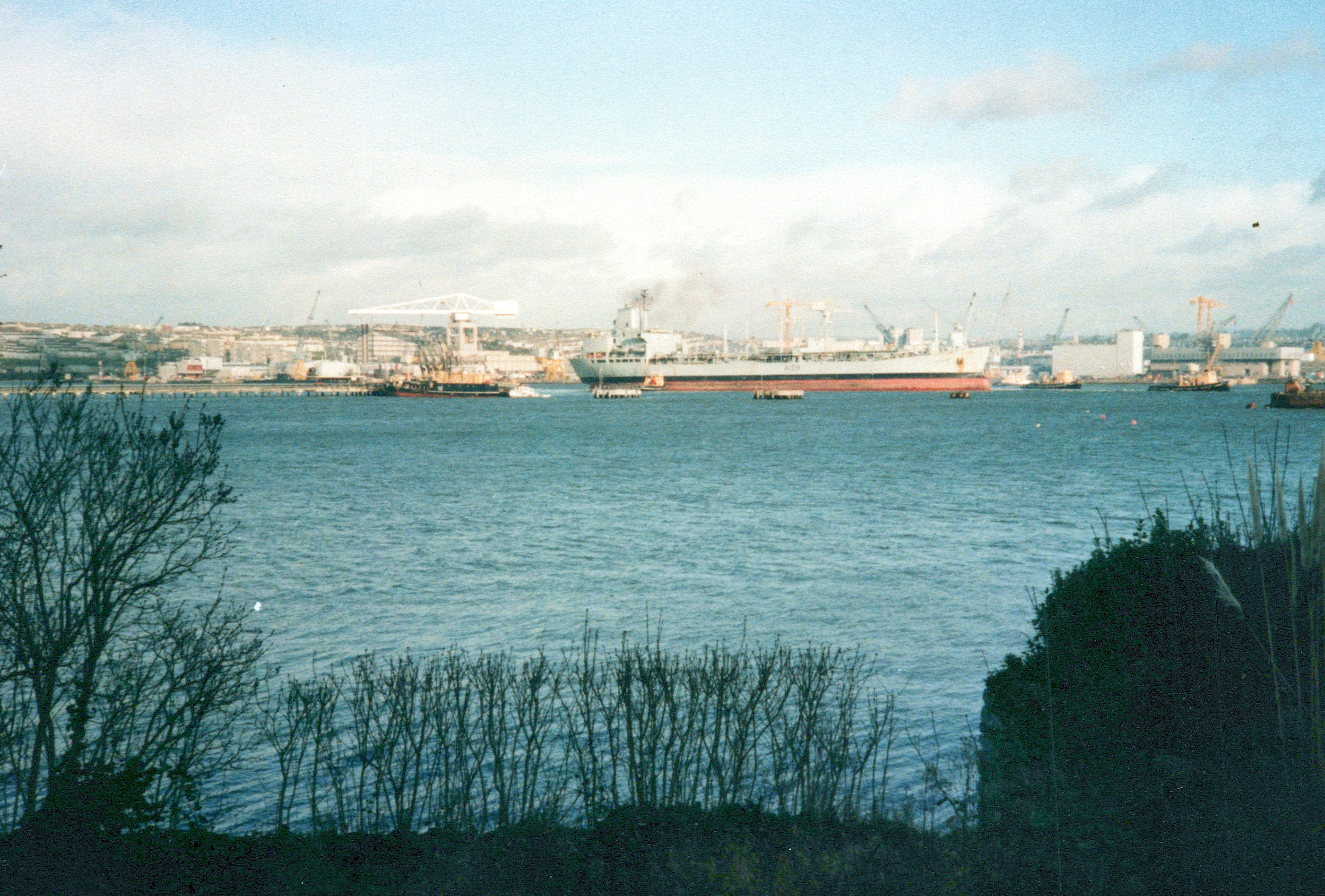 Above, is my earliest photo from 1982 showing the jetty with RFA Olwen alongside on the left. The photo was taken at the commencement of the Falklands conflict and shows the Atlantic Causeway (centre) leaving the naval base having been fitted out in readiness for support to the navy in the south Atlantic. Her sister ship, the Atlantic Conveyor had already undergone the same conversion and had left for the combat zone. She was, of course, later sunk, whilst this vessel survived.