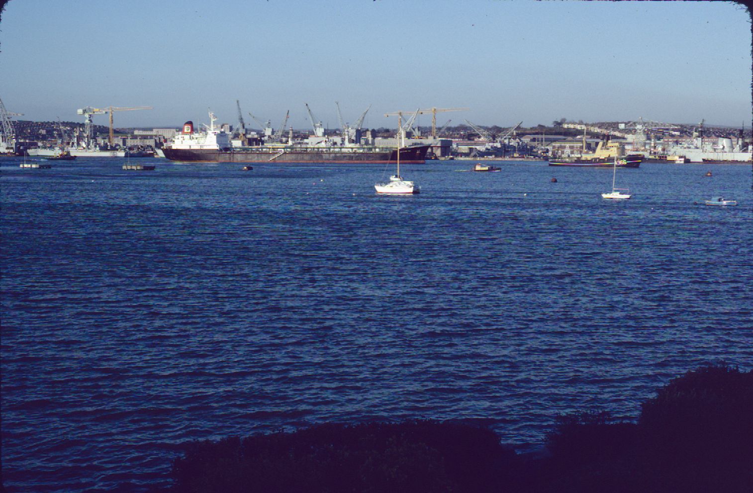 Above: Fuel supplies become highest priority during the Falklands crisis in April 1982. I believe the ship is either Olmeda or Olwen. The image is a good example of how the large crane in the submarine refitting complex (SRC) dominated the skyline in the late 20th century.