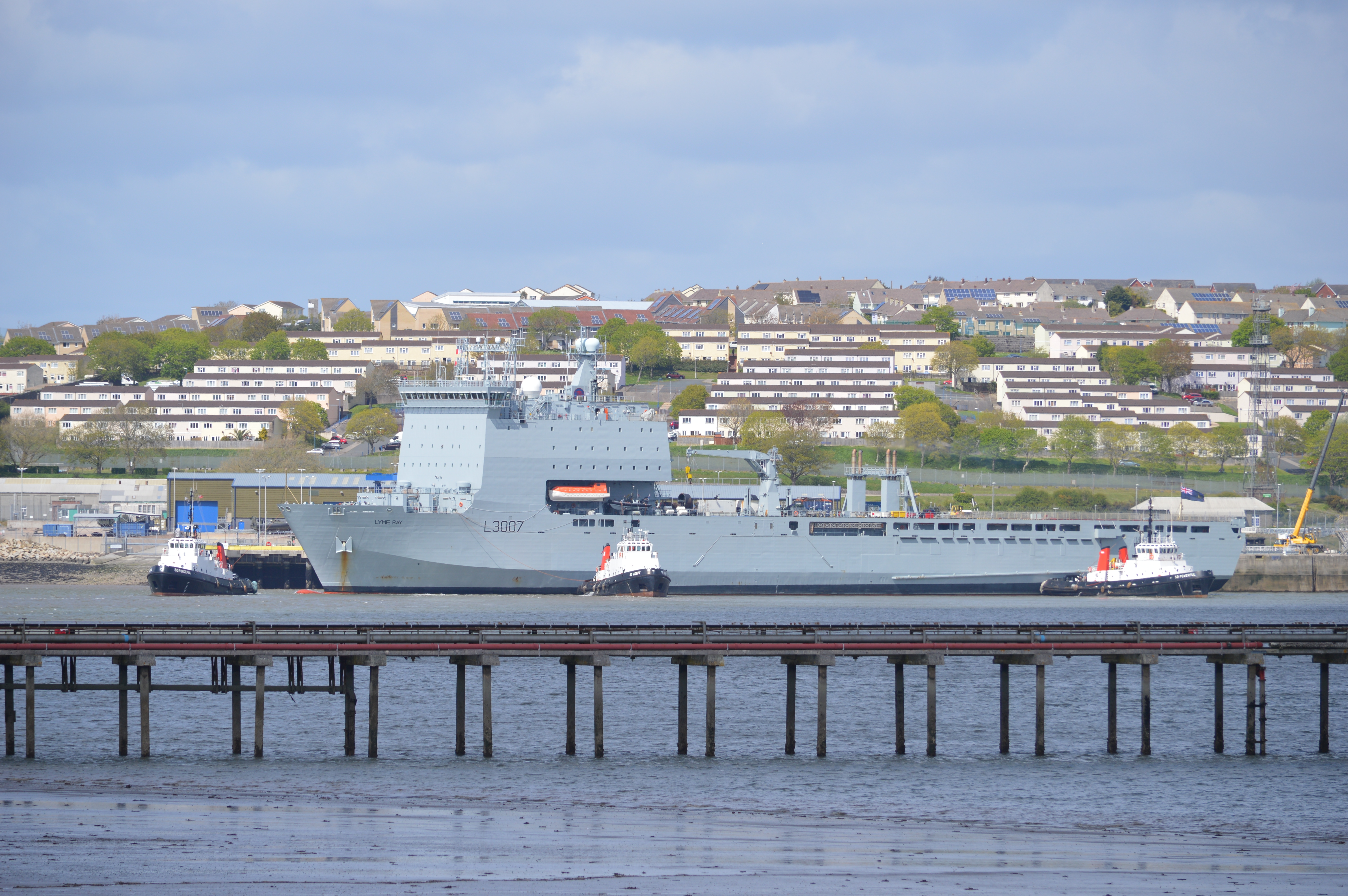 Above we see HMS Lyme Bay being manoeuvred behind the old jetty on 2 May 2018 prior to commencement of work on the new jetty.
