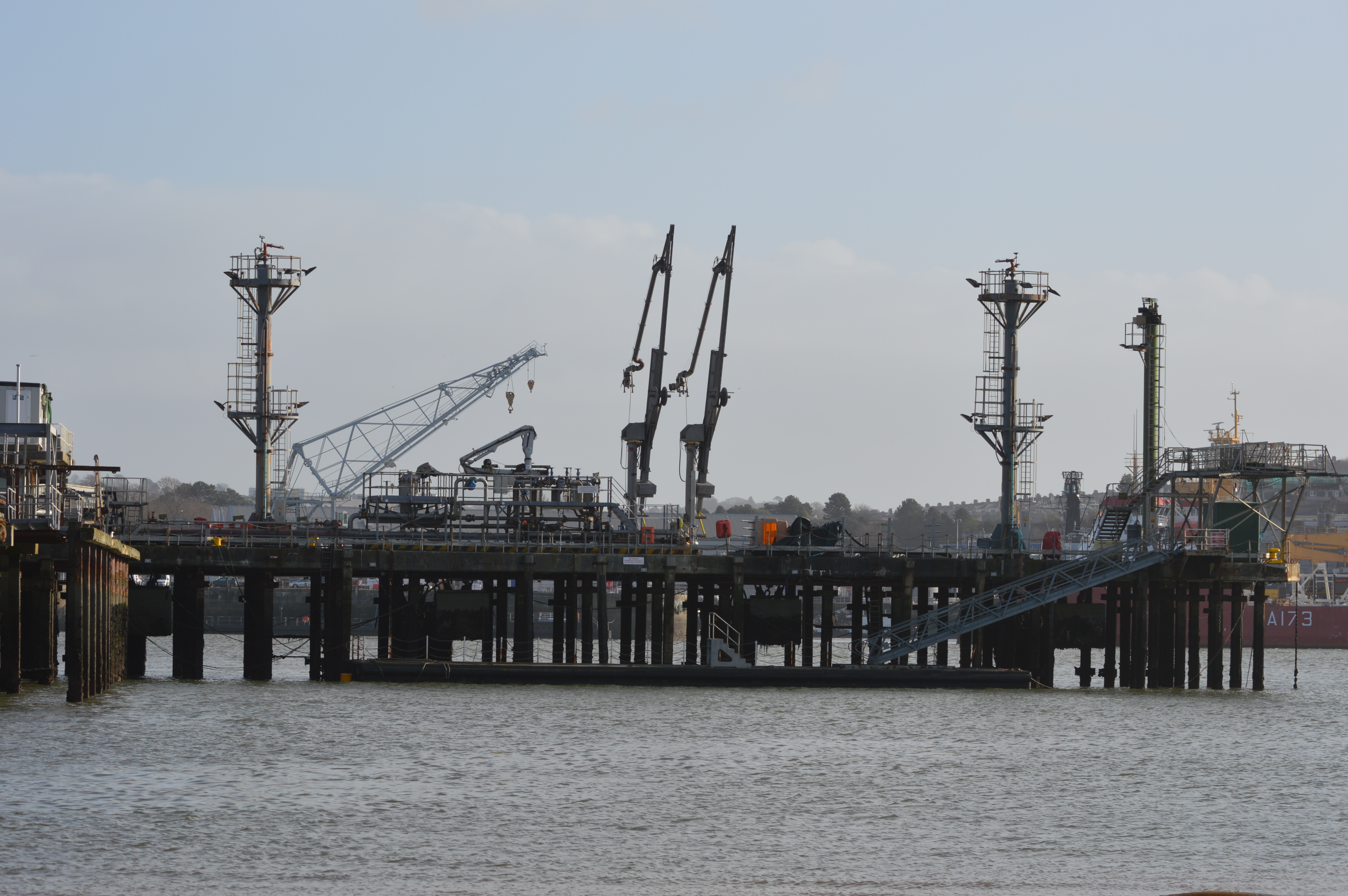 This image shows the business end of the old jetty which is for complete removal. Two fire-fighting platforms can be seen at the left and right, whilst two fuelling derricks are in the centre. For many years, a floating pontoon was on the landward side of the jetty so as to allow fuelling of the many small craft of the naval base with petrol and diesel.