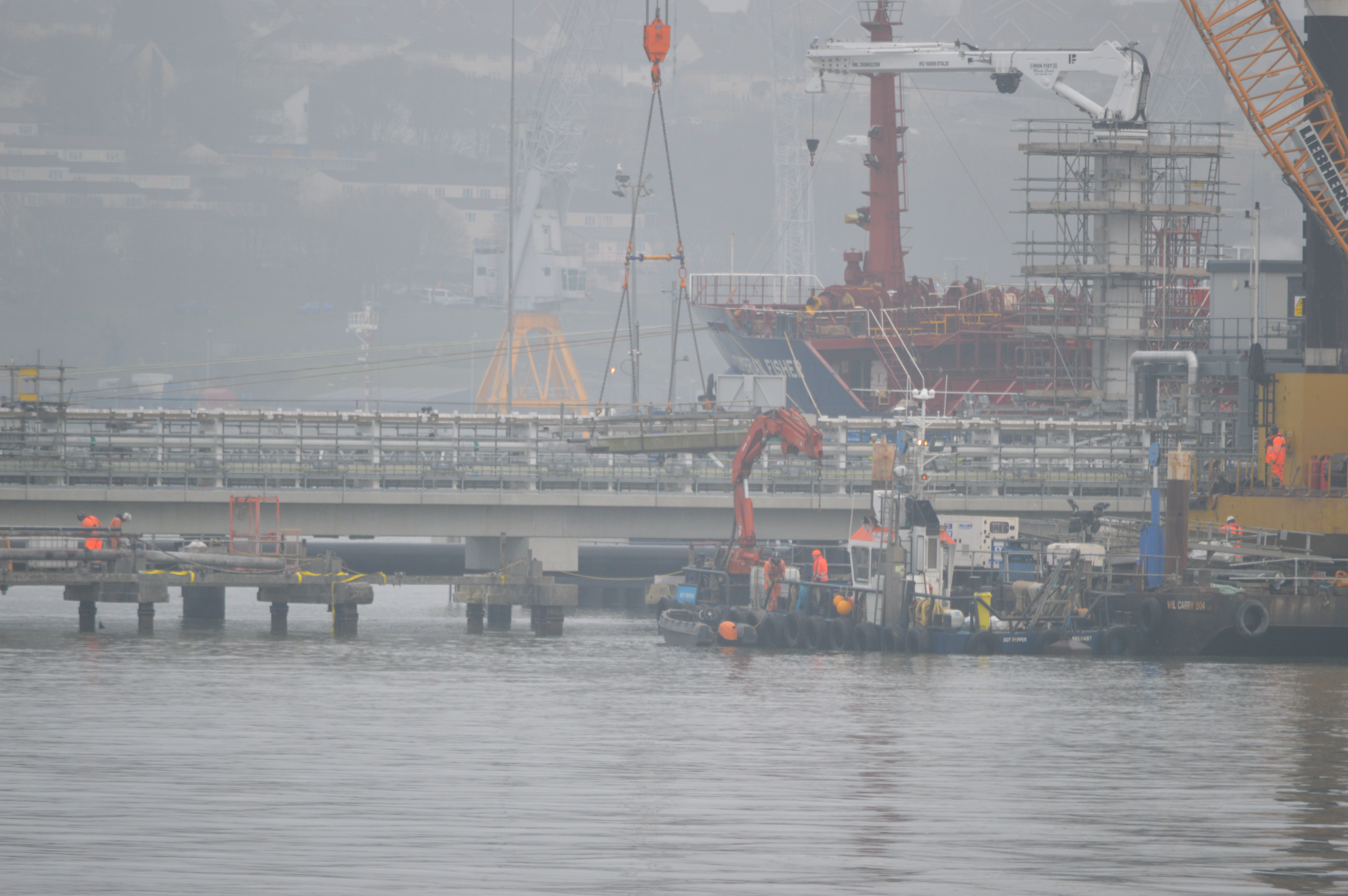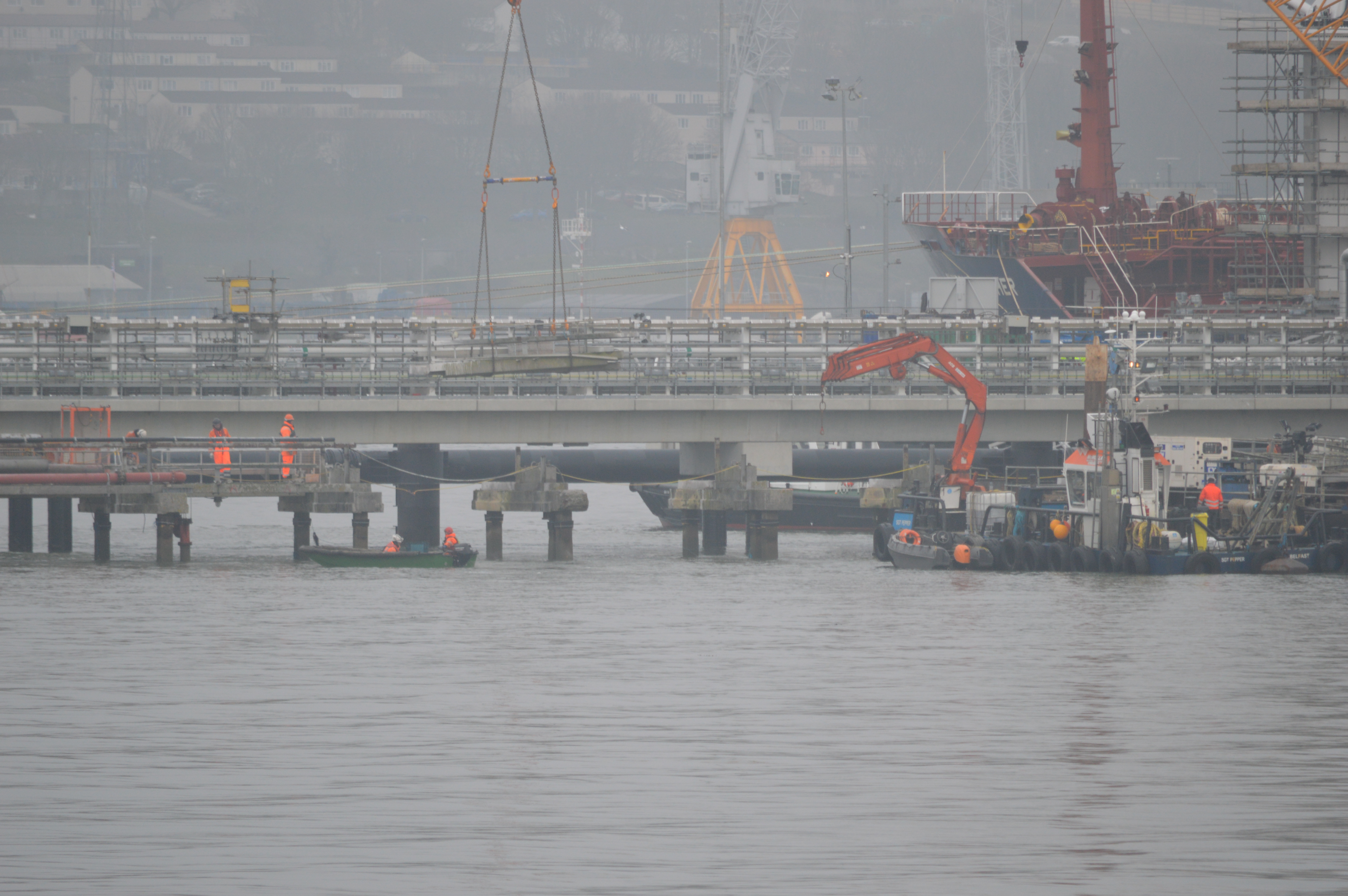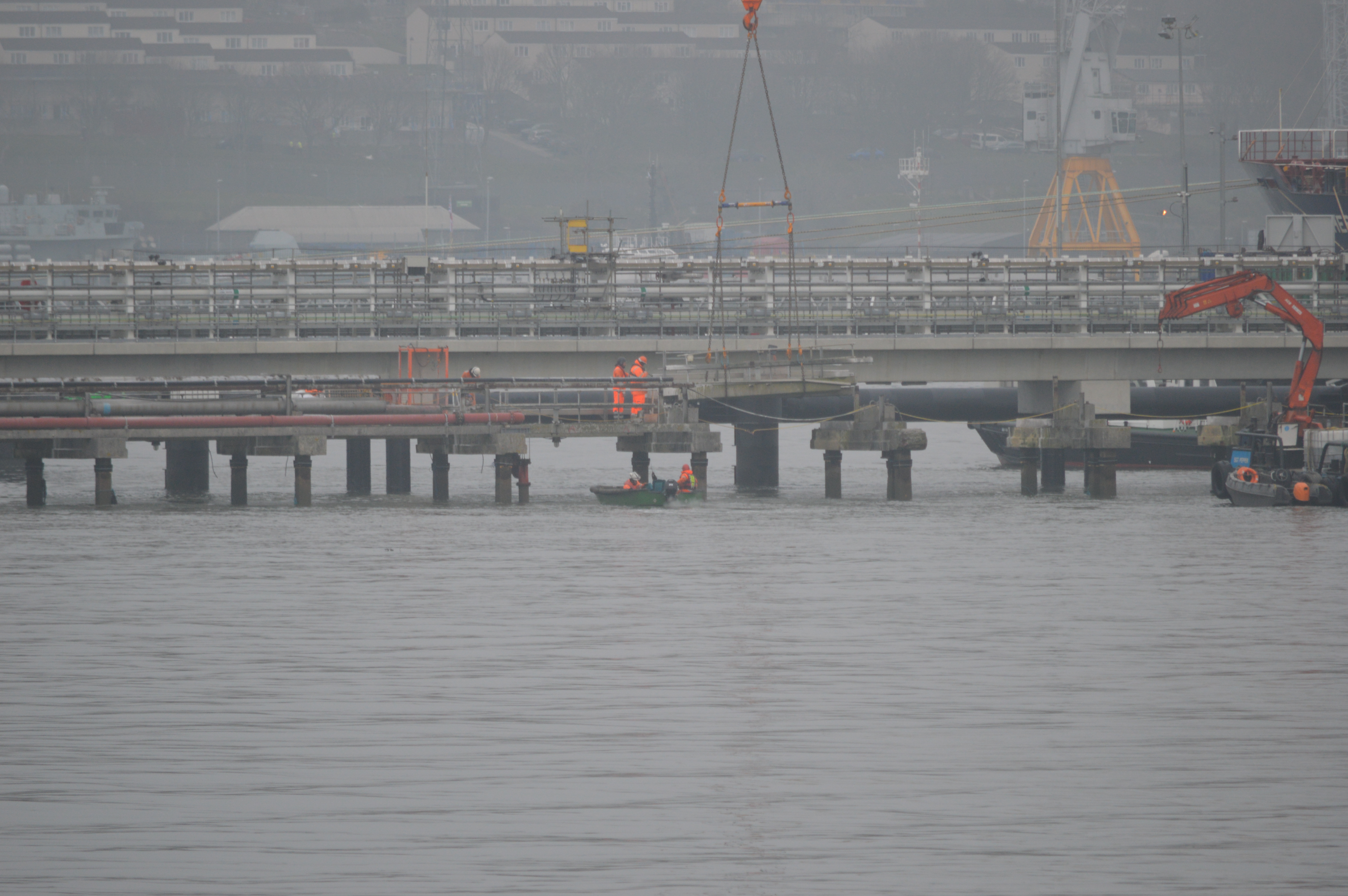 The following images, taken on a misty, damp day, 25 Jan 2023, show the removal of part of the old jetty. Much time has already been spent disconnecting each part from the whole. Sections of the three main pipes have been cut to length by oxy-acetylene cutting equipment. The crane lifts each severed piece onto an adjacent barge for disposal.