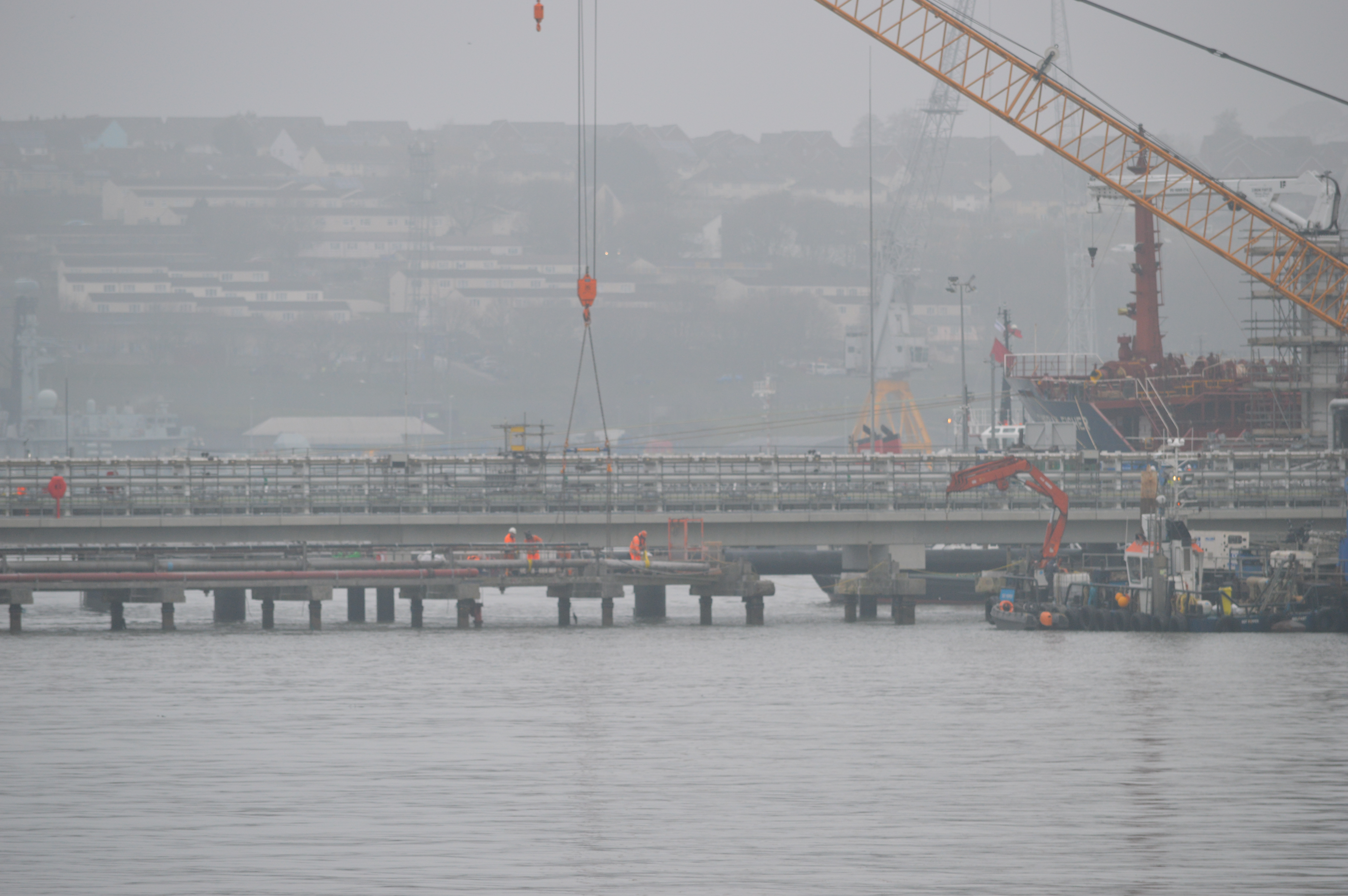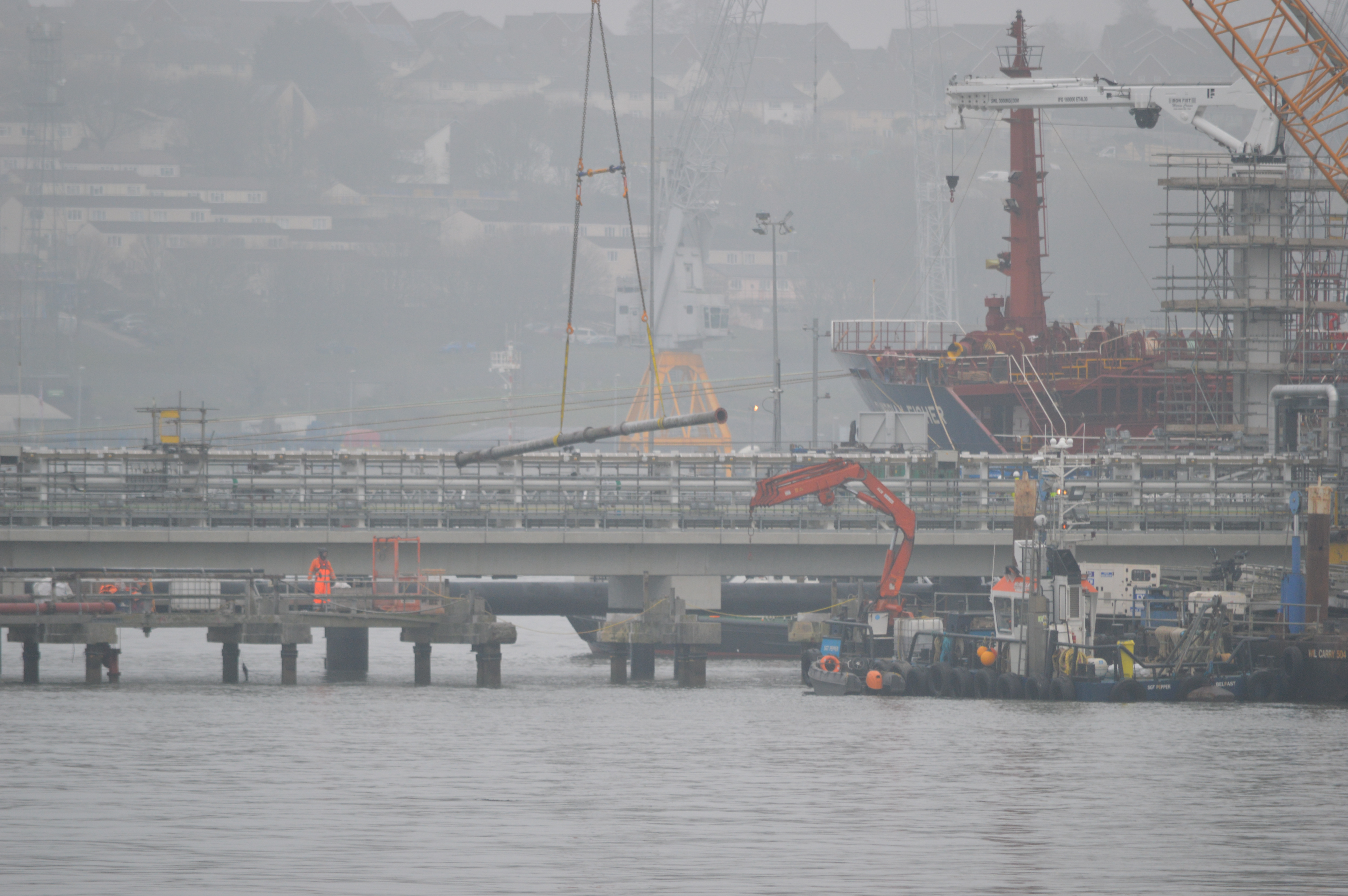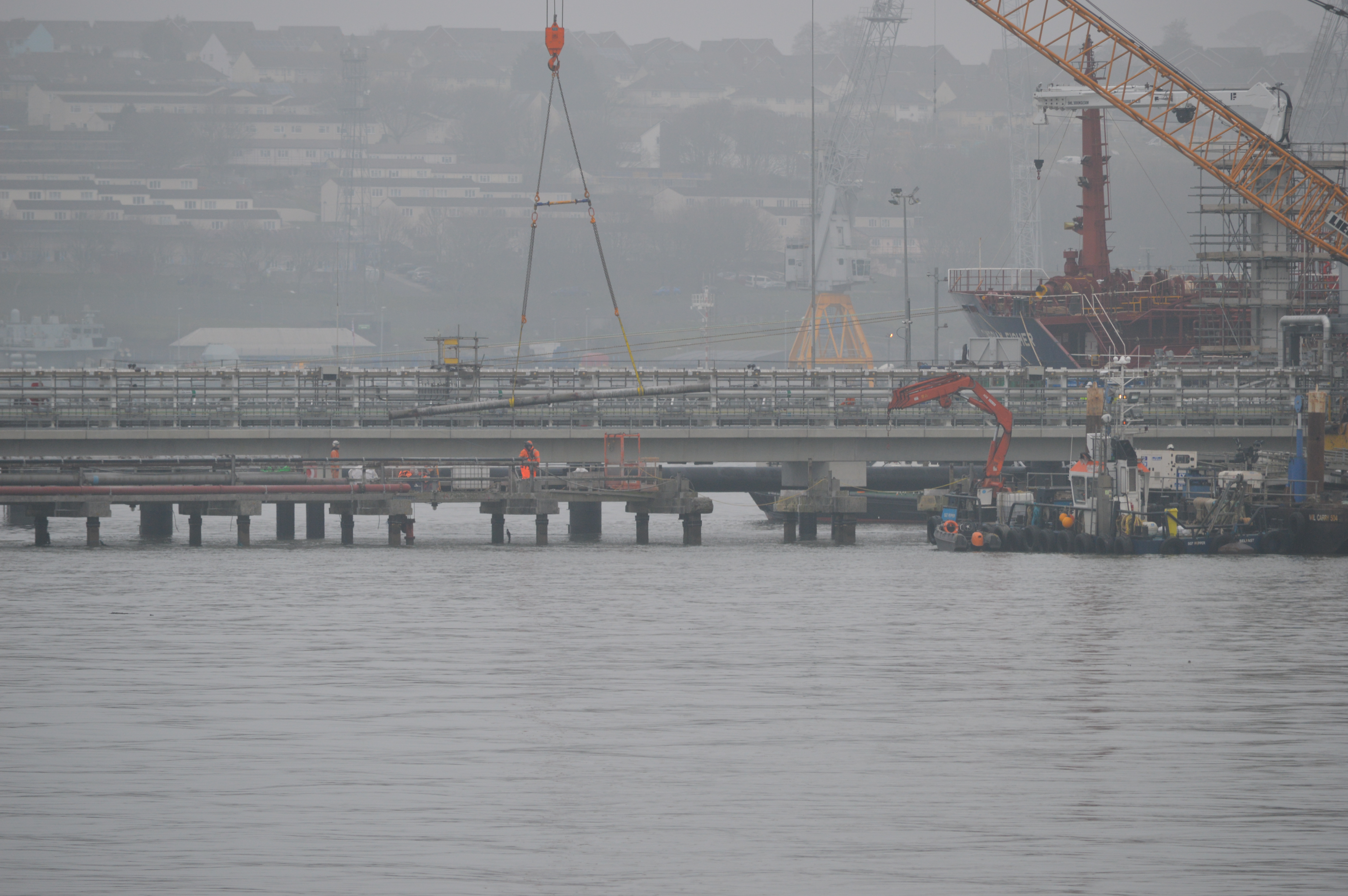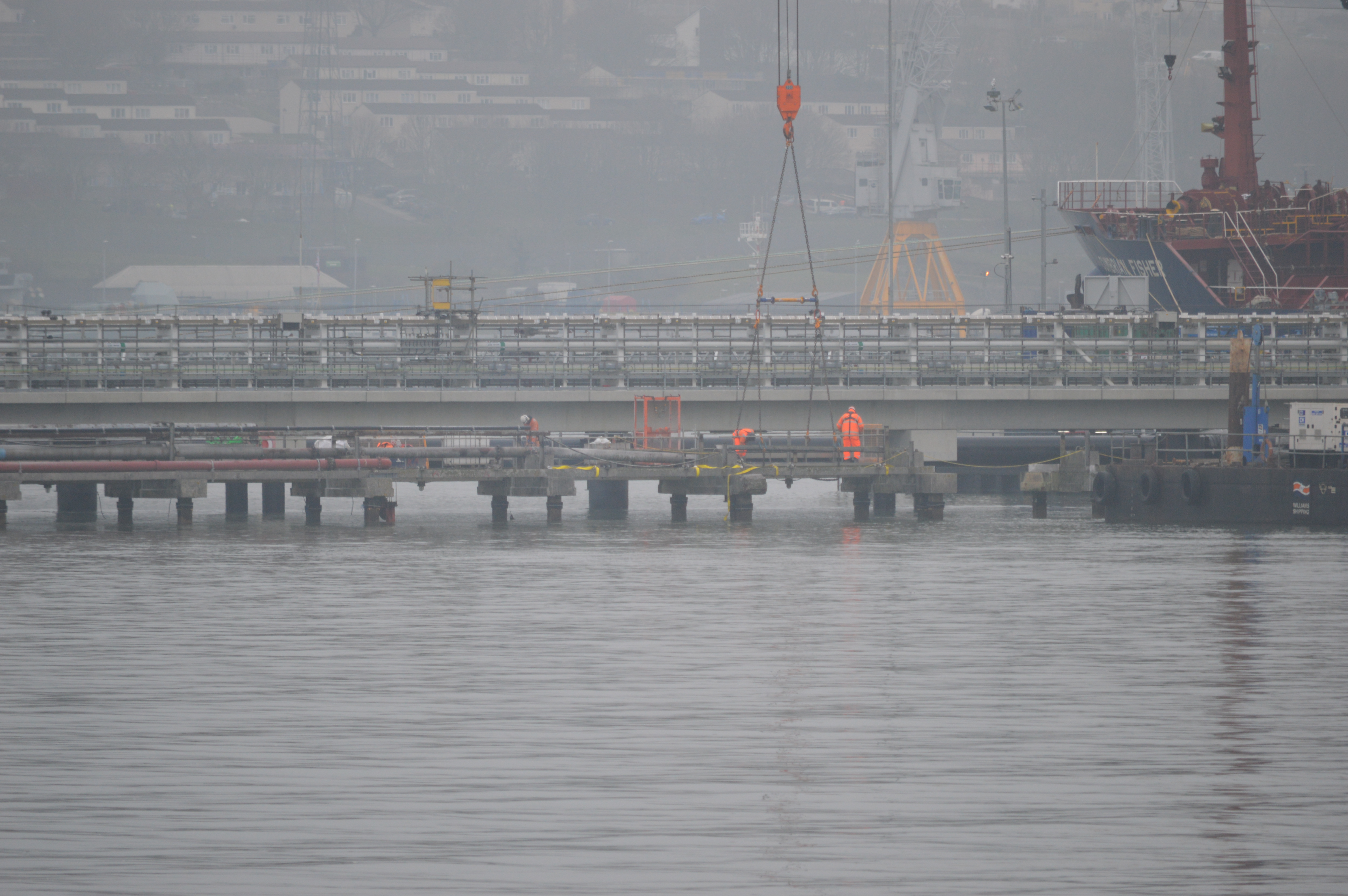 The following images, taken on a misty, damp day, 25 Jan 2023, show the removal of part of the old jetty. Much time has already been spent disconnecting each part from the whole. Sections of the three main pipes have been cut to length by oxy-acetylene cutting equipment. The crane lifts each severed piece onto an adjacent barge for disposal.