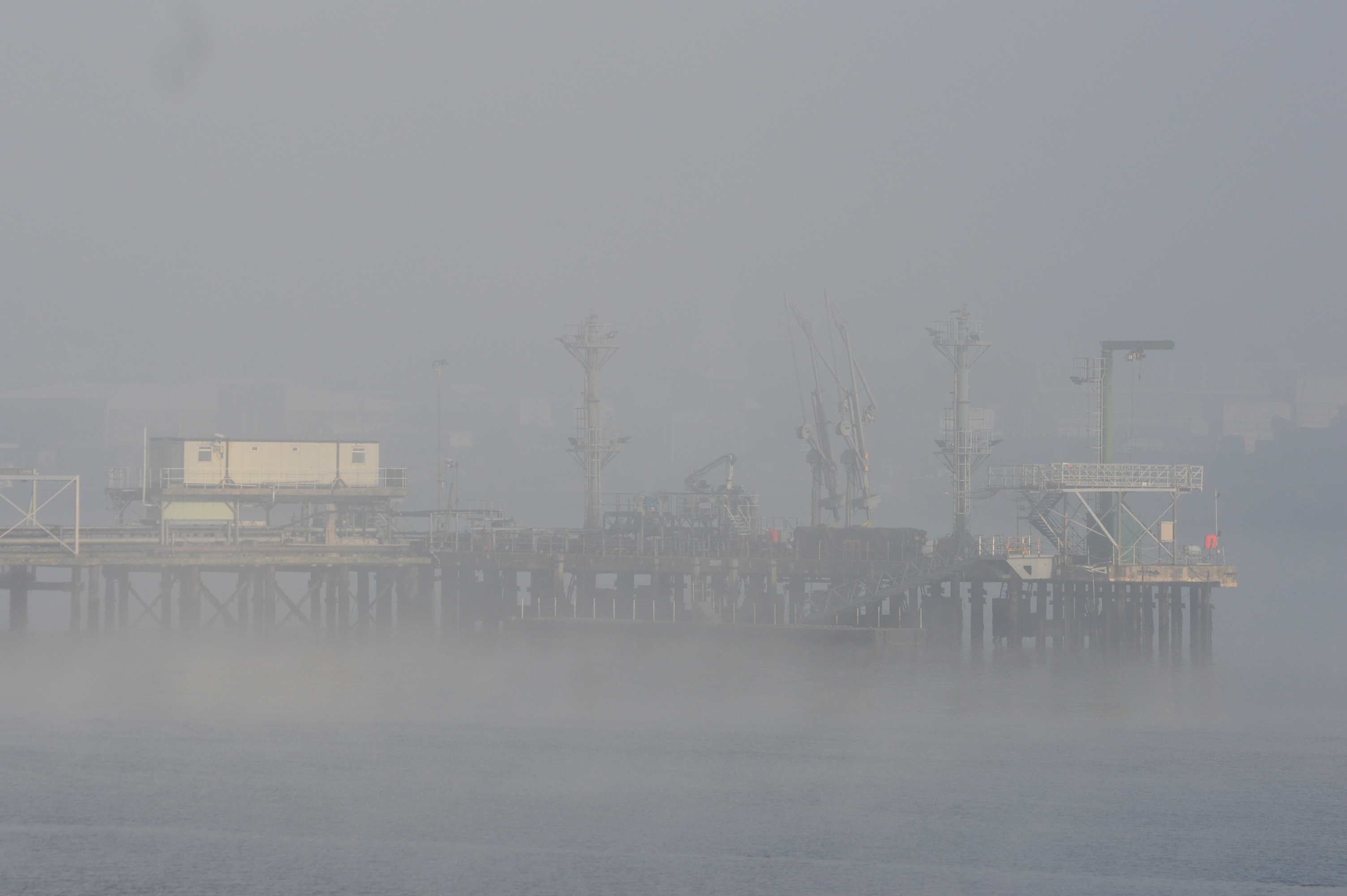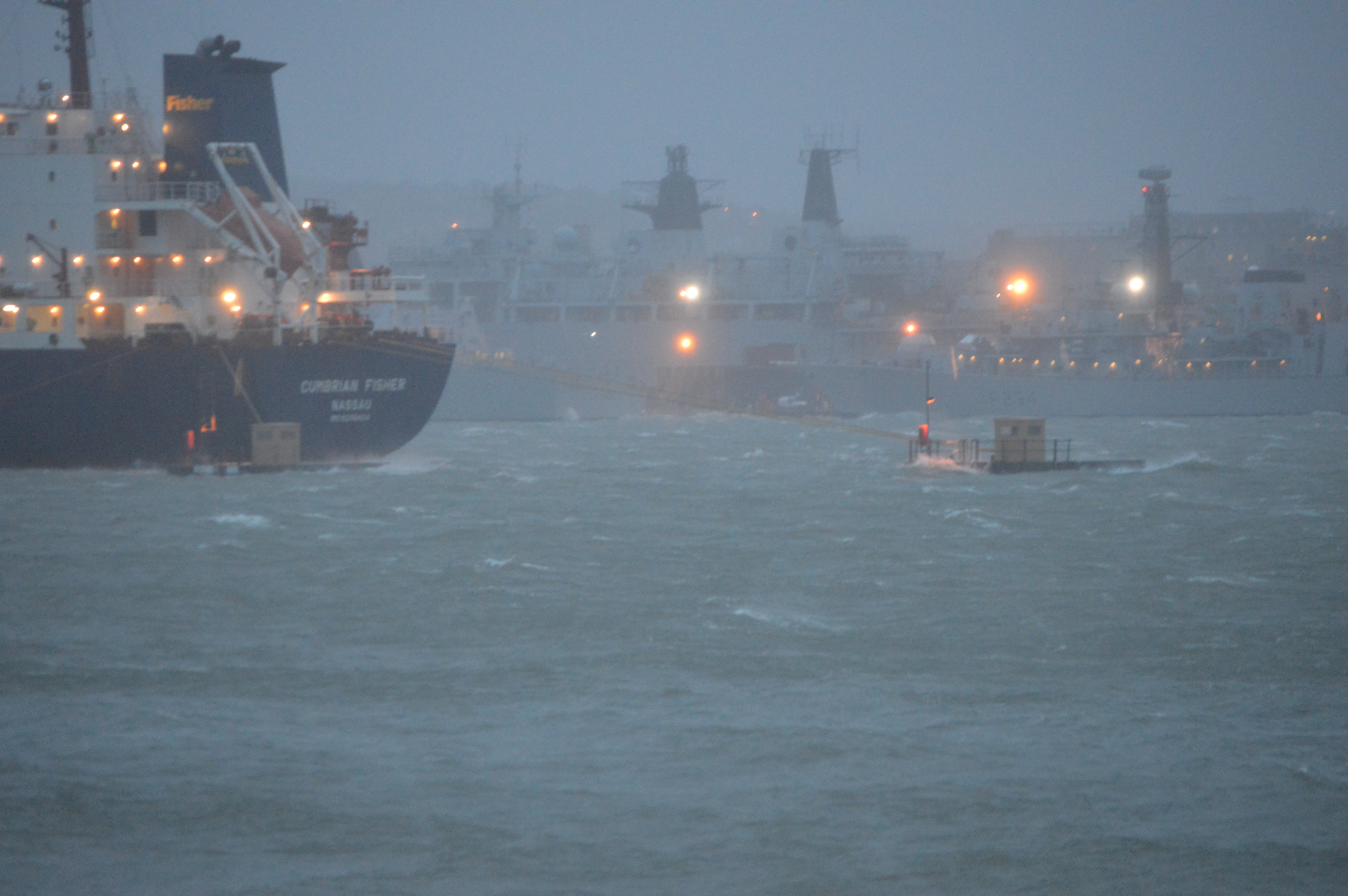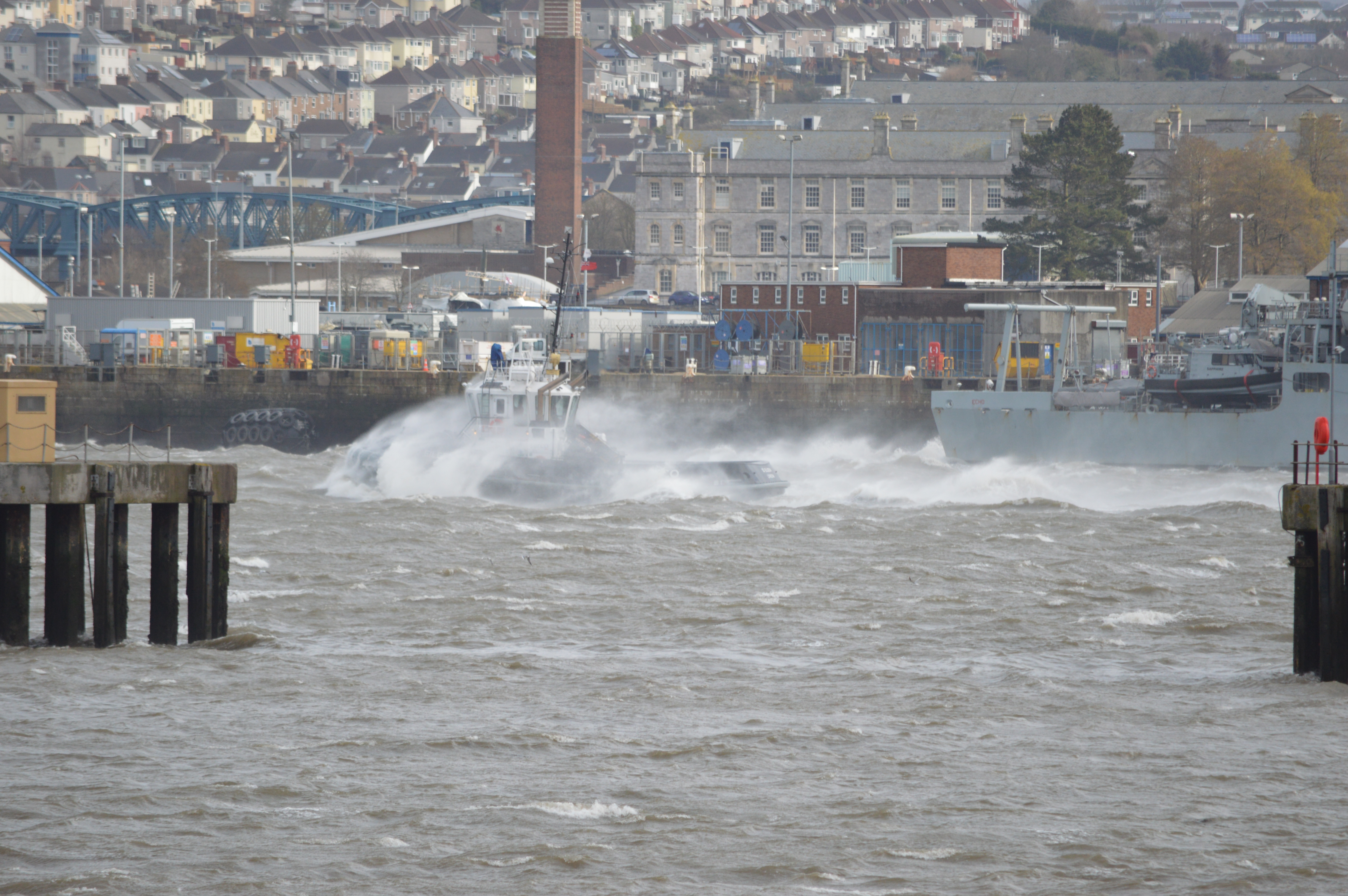 February is a bad month for weather on the river Tamar, this shot being taken of the Cumbrian Fisher alongside the jetty in Feb 2014 in a very high tide. Very low atmospheric pressure causes the tide to be even higher than it would normally be. However, the dolphins have never been completely covered.